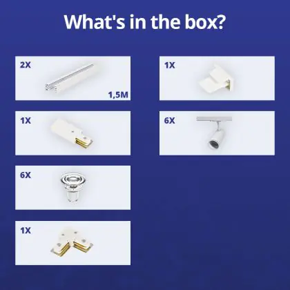 | Fabrikantnaam | Complete L shaped 1-Phase Track Set White incl. 6x Spot fixture + GU10 2700K 3W Dim – 1.5 x 1.5 mete | |